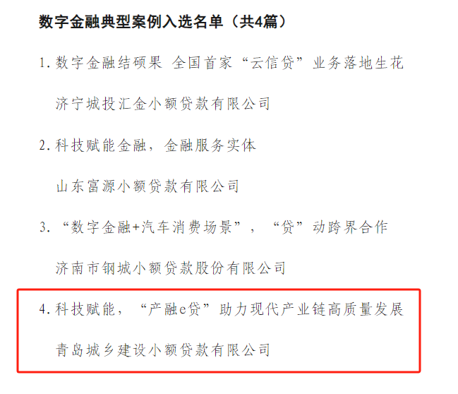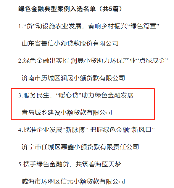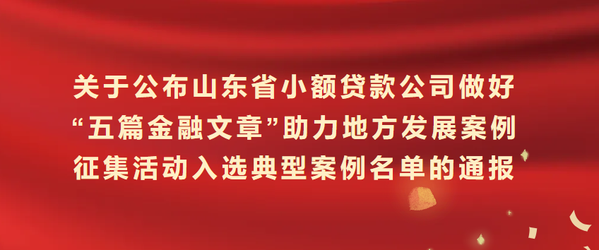 近期,山东省小额贷款企业协会发布《做好“五篇金融文章”助力地方发展案例榜单》,青岛开云在线开户城金集团旗下城乡小贷公司暖心贷、产融e贷两项业务分别入选绿色金融典型案例、数字金融典型案例。