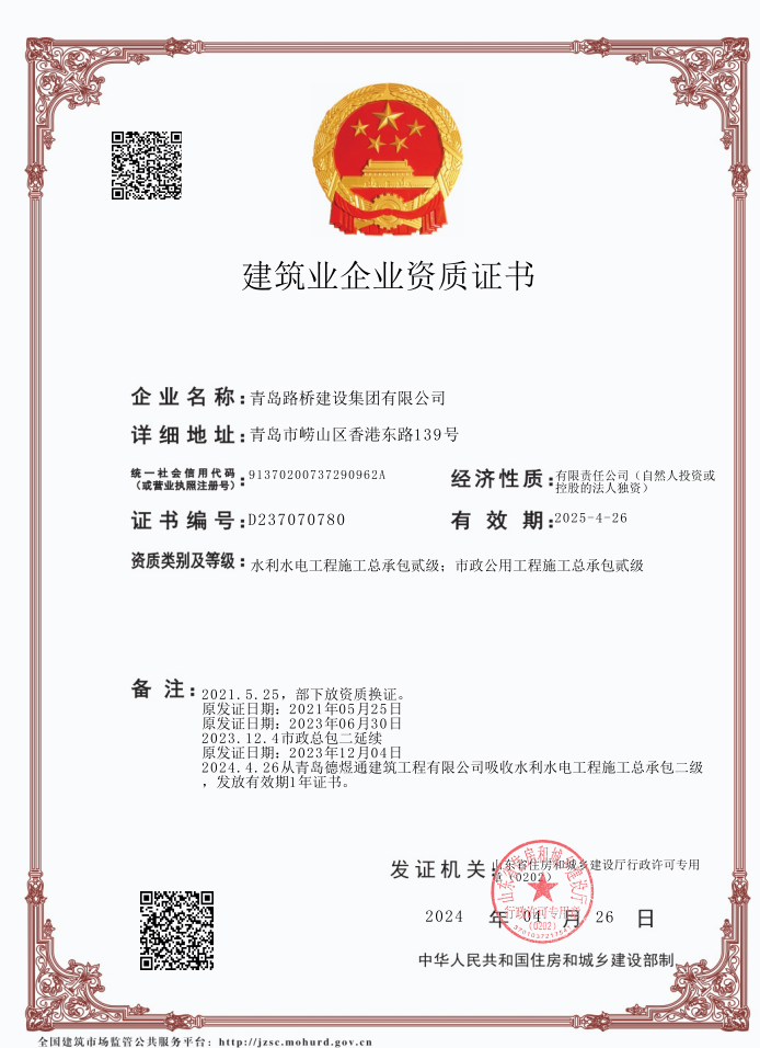 近日,青岛市行政审批局发布了《关于核准建设工程相关企业资质和建筑施工企业安全生产许可证名单的通知》,开云在线开户旗下交发集团取得水利水电施工总承包二级资质,进一步拓宽了集团水利水电工程业务承接范围,为多元化、可持续发展奠定了坚实基础。