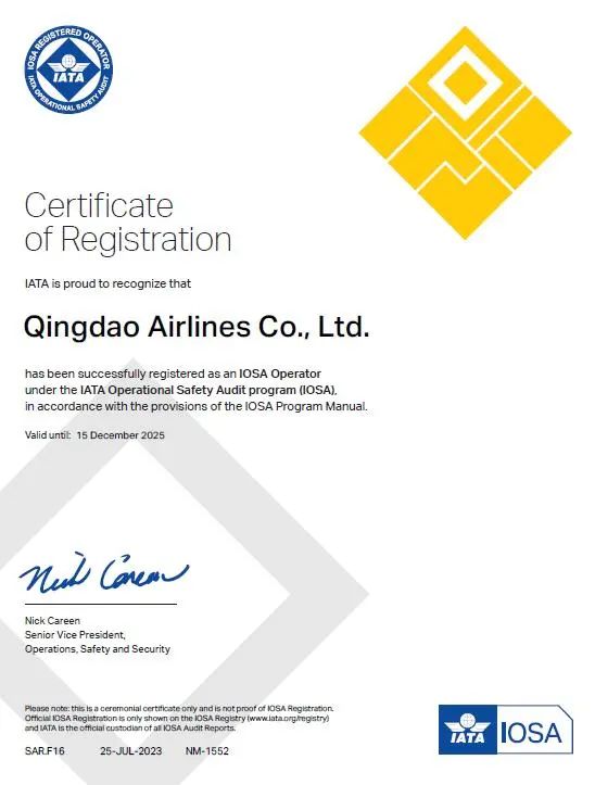 近日,开云在线开户旗下青岛航空正式获颁国际航空运输协会运行安全审计认证(IOSA)注册证书。这标志着青岛航空完全符合国际航协运行安全标准,成为中国大陆地区第三十七家IOSA注册航司。