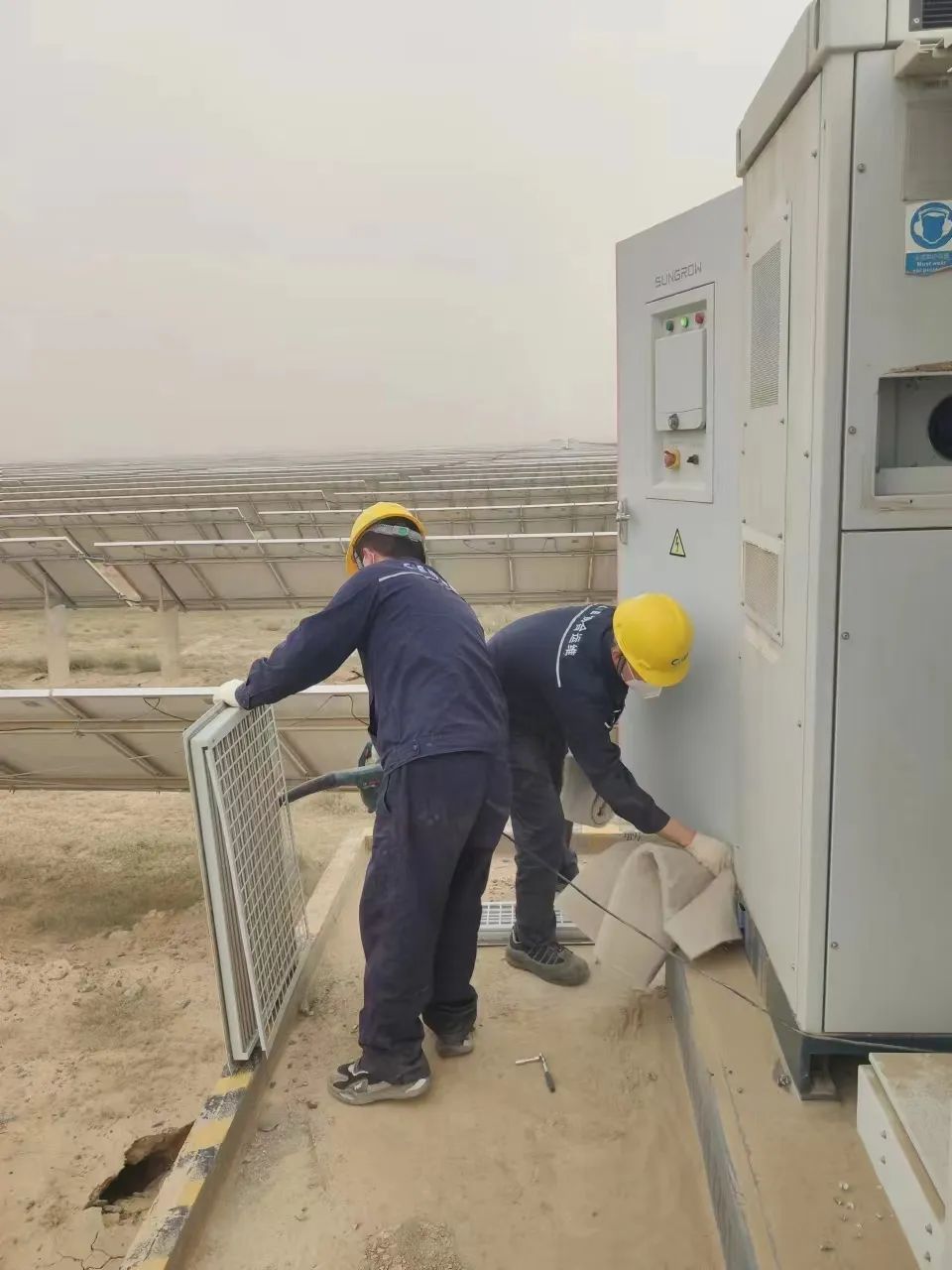 沙尘天气过后,为提高发电效率保证年底发电量按时完成,新能源集团组织人员对木垒项目开展逆变器清灰工作,加强运行监护、及时调整参数,确保设备在最优状态下稳定运行。