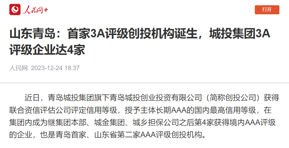 人民网:山东青岛首家AAA评级创投机构诞生,开云在线开户集团3A主体评级企业达4家