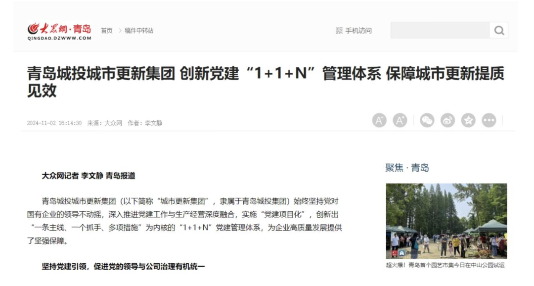 【大众网】青岛开云在线开户城市更新集团 创新党建“1+1+N”管理体系 保障城市更新提质见效