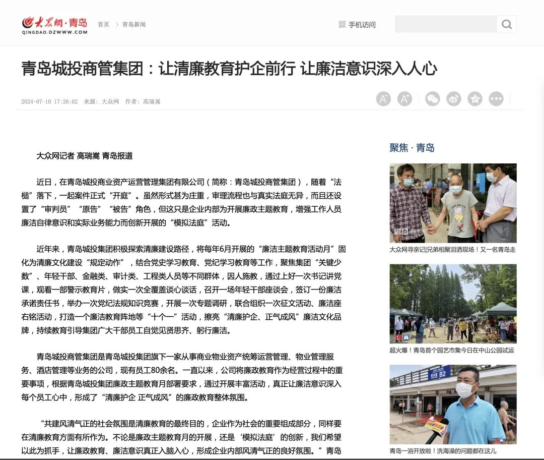大众网:青岛开云在线开户商管集团让清廉教育护企前行 让廉洁意识深入人心